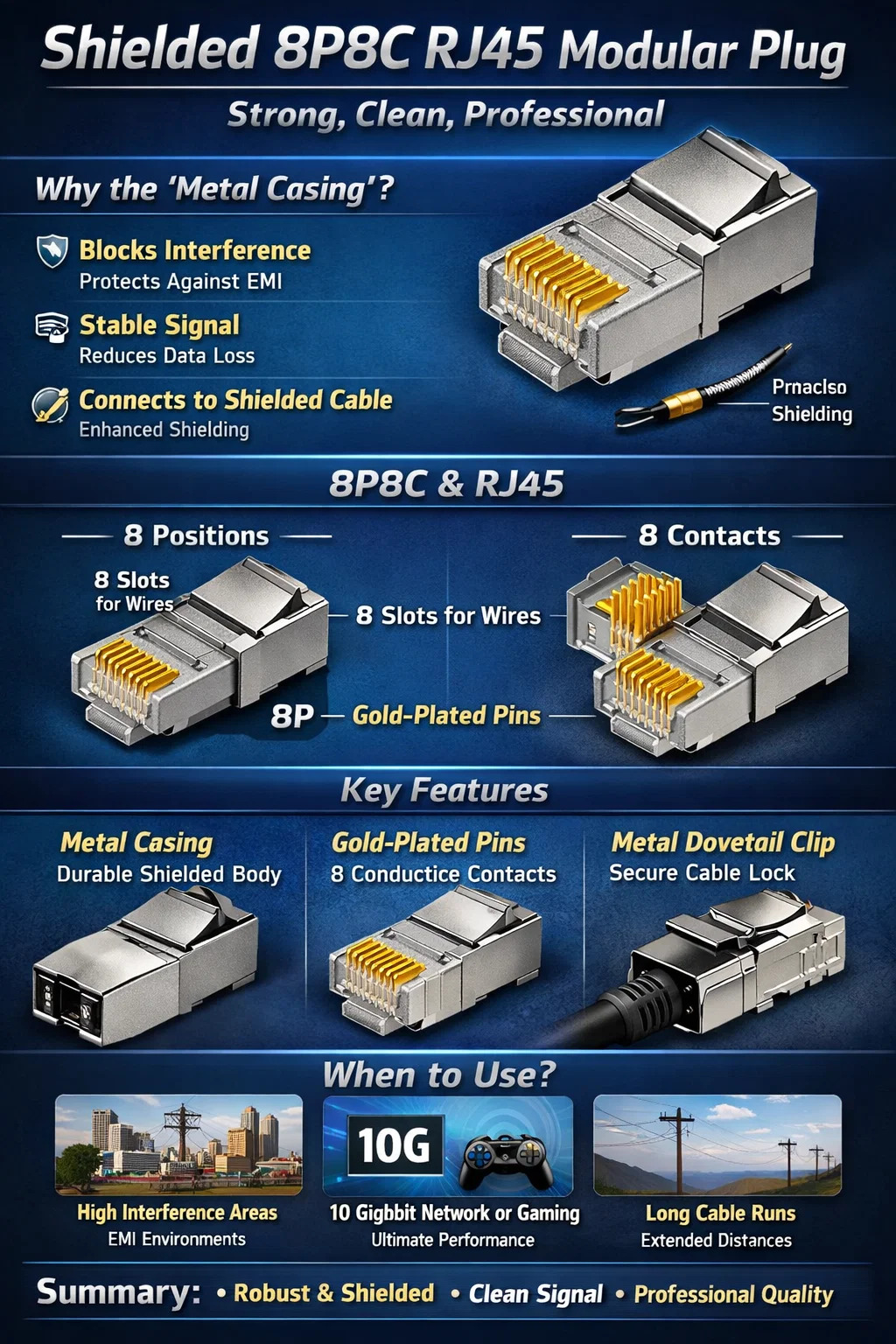 Per il cablaggio a lunga distanza: più lungo è il cavo, più è suscettibile alle interferenze ed è qui che questo connettore schermato torna utile.