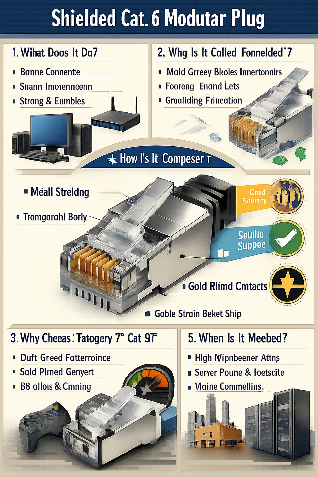 Questo Spina modulare Cat.6 schermata , in poche parole, è un connettore del cavo di rete con uno "schermo protettivo". Se hai visto connettori per cavi di rete con un involucro di metallo lucido, è tutto.
