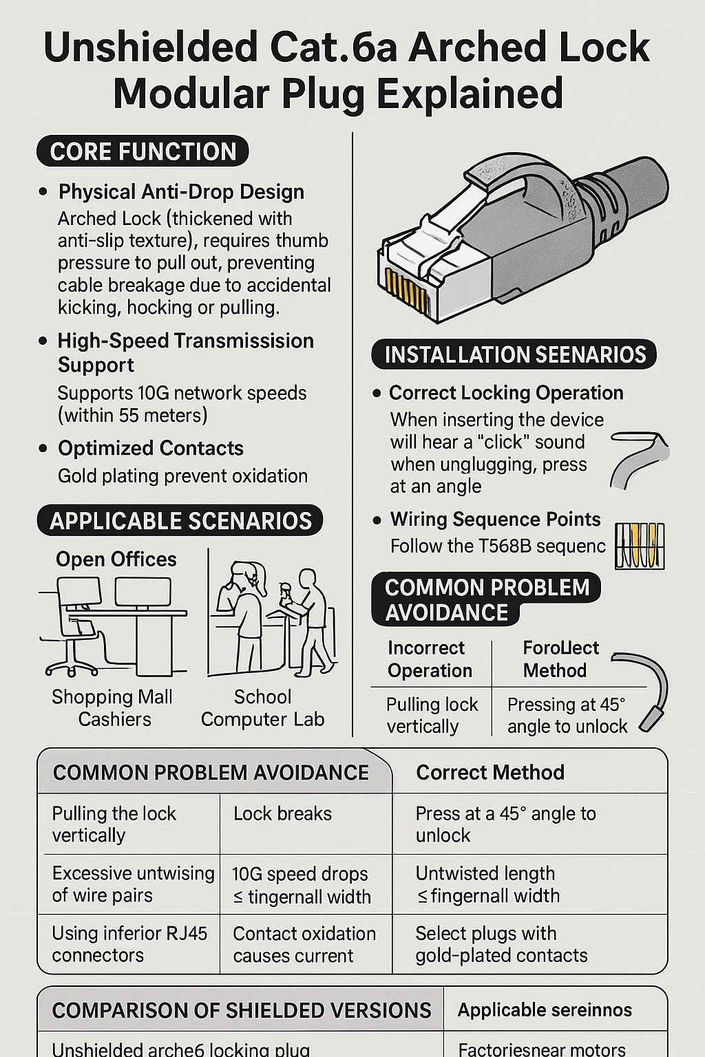 Spina modulare con serratura ad arco Cat.6a non schermata Spiegato